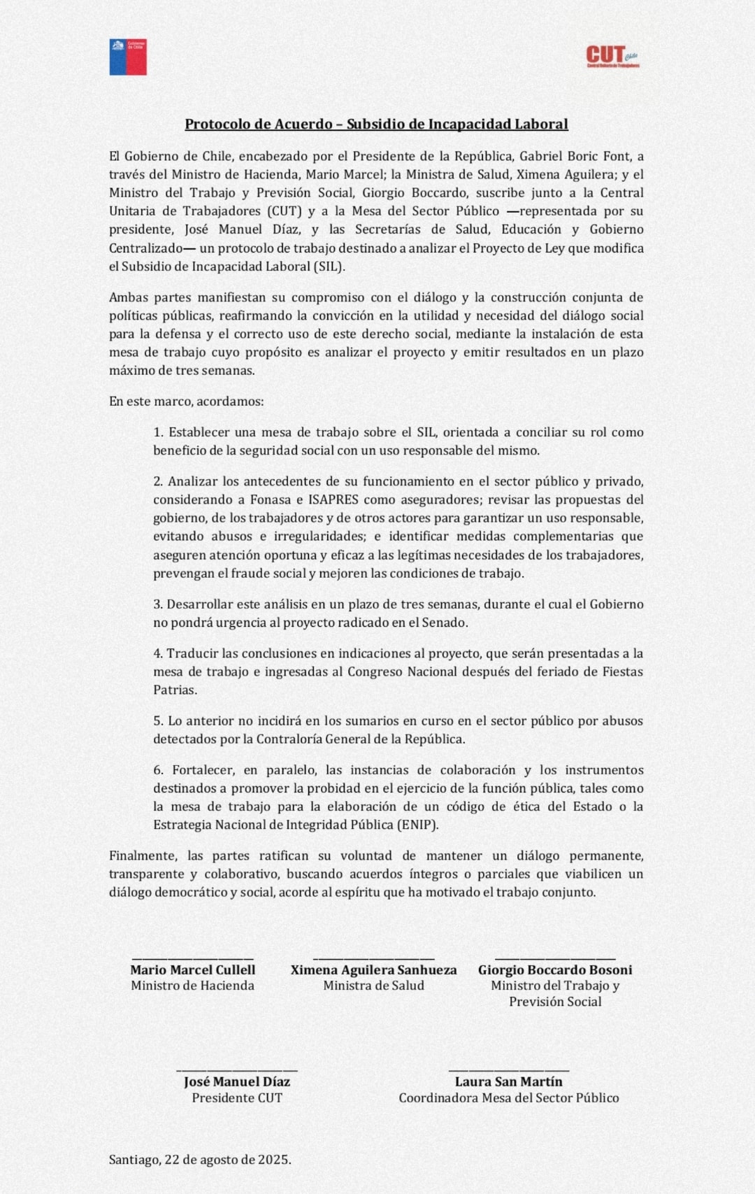 El Gobierno de Chile firmó un protocolo de acuerdo con la Mesa del Sector Público (de la cual la Confederación FENATS Unitaria es parte) y la CUT para revisar el proyecto de ley que modifica el Subsidio de Incapacidad Laboral (SIL). El documento de trabajo cuenta con la rúbrica del saliente ministro de Hacienda, Mario Marcel; la ministra de Salud, Ximena Aguilera y el ministro del Trabajo, Giorgio Boccardo. Este compromiso busca fortalecer el diálogo social como herramienta para defender y optimizar este derecho, abordando su uso responsable y previniendo irregularidades.