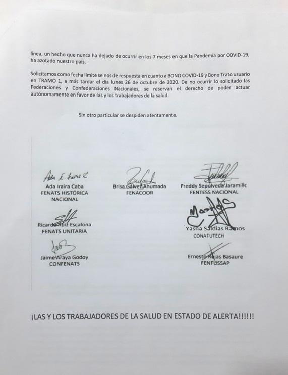 Estimados/as Dirigentes de Asociaciones y Federaciones de Fenats Unitaria: Junto con saludarles, enviamos a ustedes en adjunto 03 cartas que hoy se llevaron a los distintos Ministerios y son los siguientes: – Carta Ministro de Hacienda Sr. Ignacio Briones R. – Carta al Ministro de Salud Dr. Enrique Paris M. – Carta al Presidente de