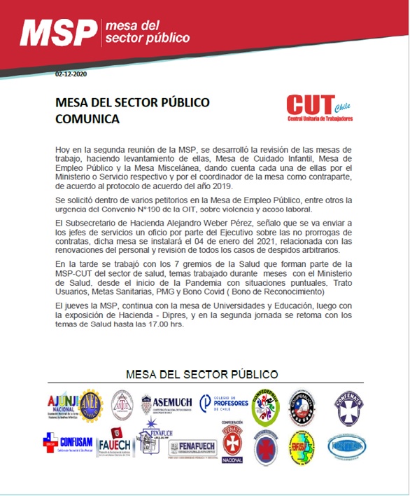 Junto con saludarles, adjuntamos “Comunicado de la MSP- Cut” con fecha 02 de Diciembre del 2020,sobre reunión del día de ayer Miércoles con Autoridades y Hacienda.