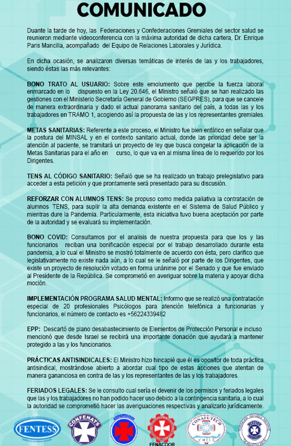 El día Viernes 26 de Junio a las 16 horas, Fenats Unitaria y los otros siete Gremios, tuvimos una Videoconferencia con el Ministro de Salud Dr. Enrique Paris M. y el Subsecretario; considero que fue una buena reunión por ejemplo: Metas Sanitarias, se mantiene lo del año pasado, Trato Usuario se envió documento a la Segpres, para que todos estén en Tramo 1, los Tens está en estudio para incluirlos en el Código Sanitario , existe Pre-estudio Legislativo; Encasillamiento, se avanzará al respecto y seguirán reuniones semanales.