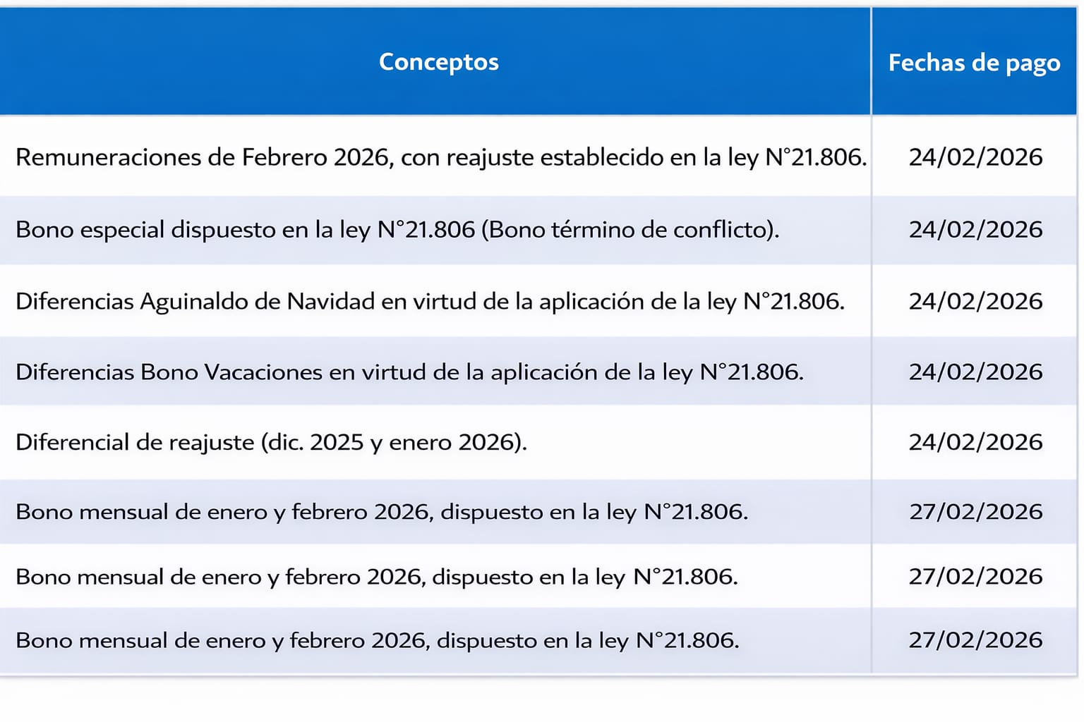 La División de Gestión y Desarrollo de Personas del Ministerio de Salud informa sobre fechas de pago correspondientes al mes de febrero de 2026 de acuerdo a la publicación en el Diario Oficial de la Ley N°21806: