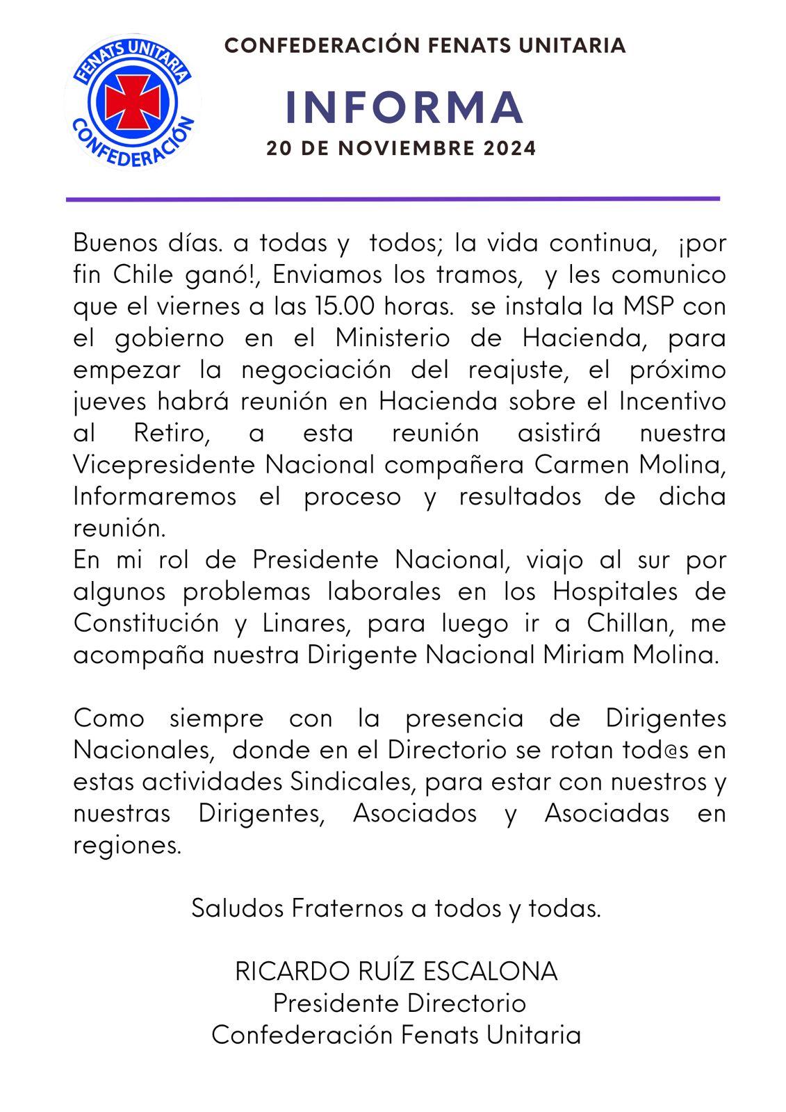 Representantes de Hospital El Peral refuerzan coordinación gremial en cia con la Confederación FENATS Unitaria