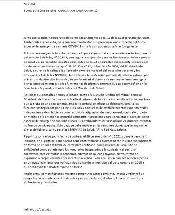 Junto con saludarles, adjuntamos Minuta bono especial de emergencia sanitaria COVID – 19.