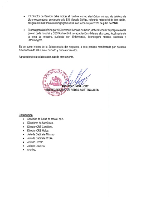 Junto con saludarles, a cada uno/a de ustedes, esperando se encuentren muy bien de salud, al igual sus familias; adjuntamos Ordinario N° 2244, el cual informa Realización de Test rápido Covid-19 para Personal de Salud.