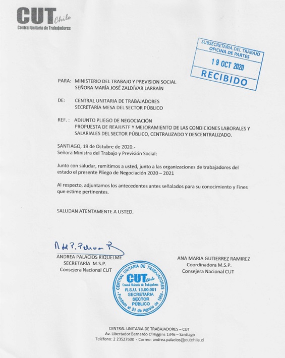 Reenviamos Oficios Conductores entregados a los respectivos Ministerios de Hacienda y Trabajo “timbrados Recibidos” por cada uno de ellos y tambien Pliego de Negociaciones de la MSP año 2020-2021, también con su respectivo timbre de “recibido”,por La Moneda.