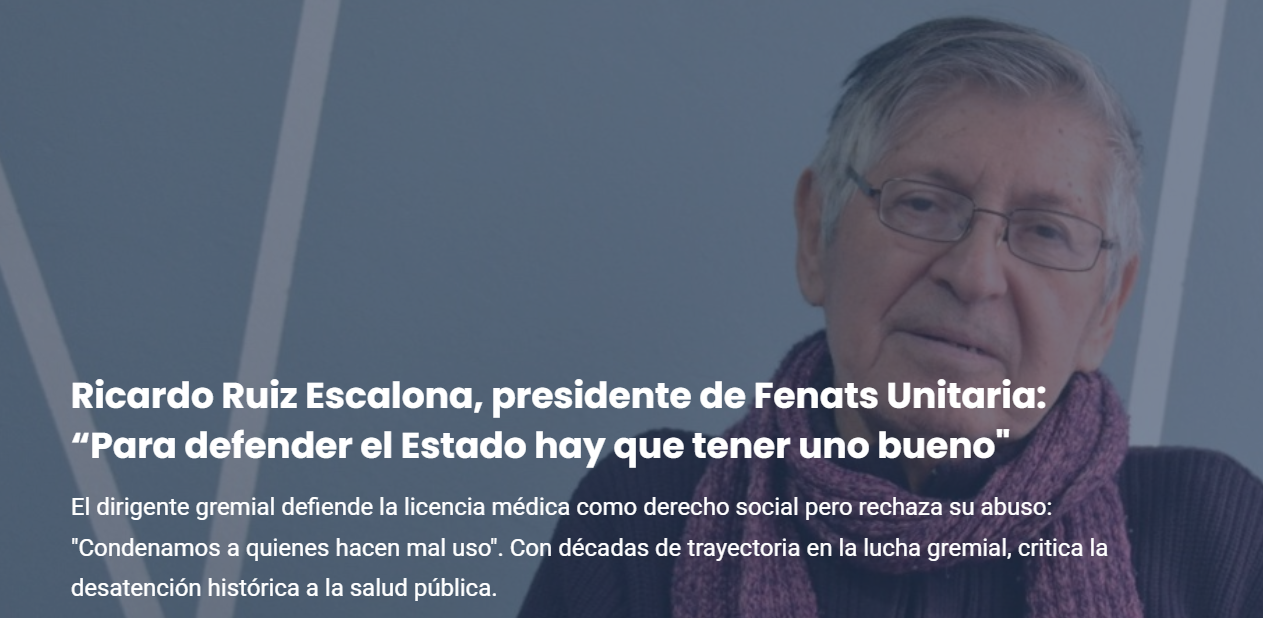 (*) Entrevistada publicada en la web de Radio Universidad de Chile El dirigente gremial defiende la licencia médica como derecho social pero rechaza su abuso: “Condenamos a quienes hacen mal uso”. Con décadas de trayectoria en la lucha gremial, critica la desatención histórica a la salud pública. Ricardo Ruiz Escalona es el presidente nacional de la
